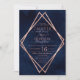 O convite para casamento elegante e moderno é perfeito para o casal noivo moderno e na moda. Ele apresenta uma borda geométrica em forma de diamante em forma de folha de rosa ouro, impressa e falsa, sobre um fundo de cor azul marinho escuro contemporâneo. O verso exibe a mesma cor d'água com uma borda listrada dourada de rosa duplo contendo uma mensagem especial da noiva e do noivo, que pode ser personalizada ou excluída. Este chic, luxo e design único será um sucesso para todos os seus hóspedes! ***NOTA DE DESIGN IMPORTANTE: Para qualquer solicitação de design personalizada, como solicitações de correspondência de produtos, alterações de cor, mudanças de posicionamento ou qualquer outra solicitação de alteração, clique no botão "CONTACT" ou envie um e-mail ao designer diretamente em lafemme.art@gmail.com. Você pode até enviar um e-mail para ela solicitando um design completamente personalizado e novo.