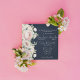 Um buquê lindo de Peonies cor-de-rosa contra um fundo marinho cria um contraste notável neste convite para o casamento. Localizar produtos correspondentes na minha loja para ir com este convite, como Salvar a Data, RSVP etc