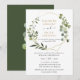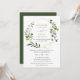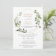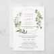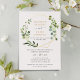 Este convite de casamento elegante e personalizável apresenta uma moldura geométrica dourada adornada com bela folhagem de aquarela verde e foi combinado com uma caligrafia caprichosa e uma fonte serif elegante em dourado e cinza. Para fazer alterações avançadas, selecione a opção "Clique para personalizar ainda mais" em Personalizar este modelo.