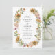 Capture a beleza da sua história de amor com este elegante convite para o casamento, com uma coroa pintada à mão de flores ouros, flores poeirentas, azuis e pincéis, rosa, e delicadas margaridas brancas, enquadrando seus nomes na frente. O romântico trabalho de arte floral adiciona um toque de charme rústico e elegância boho, perfeito para primavera, verão ou casamentos outono. No verso, um buquê floral coordenador envolve o texto para o seu website de casamento, misturando praticidade com estilo num design coeso e artístico. Deixe este convite dar o tom para uma celebração que é tão cuidadosamente curada quanto bonita — comece a personalizar sua suíte perfeita hoje.