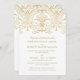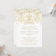 Os convites de casamento inspirados pela Elegant Vintage contêm um design decorativo de ornamentado de cor dourada champanhe que tem uma aparência de ximmer metálico. A impressão na opção Cartolina Luxe Pearl Shimmer melhora o aspecto metálico das cores da design dourada.