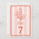Ilustração botânica floral de arte em linha vermelha sobre fundo de faixa rosa com texto vermelho e quadro desenhado à mão.