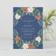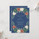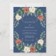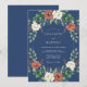 O rico azul marinho forma o pano de fundo para uma grinalda floral deslumbrante. Flores profundas de ferrugem e brancas cremosas se entrelaçam com folhagem verde exuberante, criando uma atmosfera romântica e elegante. Este design evoca um senso de charme atemporal e beleza natural para uma ocasião especial.