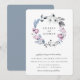 Bela grinalda em aquarela de flores e folhagens azul poeira, cinza e rosa malva, convite de casamento. O verso do cartão apresenta cor azul poeira sólida.