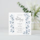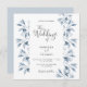 Um convite de casamento em branco e azul empoeirado. Um fundo branco chic na frente. Decorados com prigos e folhagem azuis botânicos. Escrita moderna e extensa, tipografia com o texto: O casamento de... Modelos para nomes próprios e detalhes do casamento. Texto das cinzas escuras. Fundo: fundo azul empoeirado.