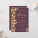 Um convite de casamento botânico no cassis, roxo profundo e ouro falso. Decorado com folhagem de ouro falso e grampos. Escrita escrita em letras grandes modernas, tipografia com o texto: O casamento de. Modelos para seus nomes e detalhes do casamento. Texto do ouro. Traseira: fundo colorido do gabinete.