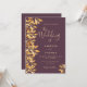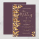 Um convite de casamento botânico no cassis, roxo profundo e ouro falso. Decorado com folhagem de ouro falso e grampos. Escrita escrita em letras grandes modernas, tipografia com o texto: O casamento de. Modelos para seus primeiros nomes e detalhes do casamento. Texto do ouro. Traseira: fundo colorido do gabinete.