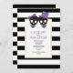Casal de crânio preto e listras brancas púrpura convite para o casamento de Halloween. Um casal preto divertido com um arco roxo e um chapéu emparelhado com uma elegante borda de padrão listrado preto e branco são os elementos deste convite moderno.