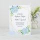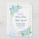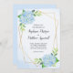 Estes convites para casamento de aquarelas apresentam uma hidrangea azul-aquarela e design de folhagem com falso quadro geométrico dourado. Personalize-os com o seu próprio texto. Visite nossa loja para ver a gama de cheios de produtos correspondentes que você pode personalizar para o seu casamento.
