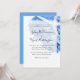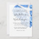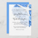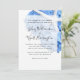 Convites de casamento para o Jardim das Seínas com uma flor azul de hydrangea e uma estrela branca do mar. Personalize o texto preto em três locais, com os nomes de cheio do casal na fonte de script elegante. O design floral é colocado atrás de um painel branco que contém o texto.