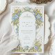 Este gracioso convite para o casamento apresenta um design Art Nouveau pintado à mão em tons de aquarela, perfeito para casais que buscam um toque refinado e artístico. A frente exibe um arco floral romântico repleto de flores azuis, creme, pincel e verde-sábio macio, entrelaçados com folhas giratórias e rolhas de ouro que criam um quadro botânico antigo em torno do texto do casamento. Feitas em um delicado estilo de pintor, as flores e folhagem ecoam a elegância das artes decorativas do início dos anos 1900. A tipografia refinada emparelha fontes clássicas serif com sutis toques modernos, enquanto as iniciais e o ano são sutilmente integrados na fronteira ornamental. O verso do cartão complementa a frente com uma crista floral espelhada com flores silvestres azuis e tendrils estilizadas, enfatizando elegância e harmonia. Ideal para temas românticos, de jardim ou de casamento clássico.