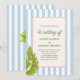 Celebre seu dia especial com um clima tropical retrô divertido! Este convite de casamento apresenta um fundo listrado azul suave, folhas de palmeira e uma moldura com corda e texto verde. Perfeito para casais que amam elegância caprichosa com um toque de charme da ilha.