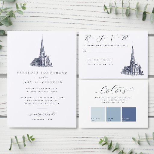 Convites Casamento de Ilustração da Igreja Vintage Elegante