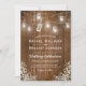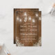 Convites de casamento de Natal com tema de inverno com fundo de madeira de celeiro rústico, luzes de corda em pote de vidro cintilante, decoração de canto floral de bebê respirando, etiqueta amarrada com um nó apresentando suas iniciais e um modelo de casamento simples.