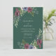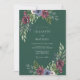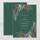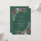 Este design apresenta um rico fundo verde floresta adornado com aglomerados florais sombrios. Rosas burgundy profundas e anemônias azuladas criam um contraste marcante contra a folhagem exuberante de eucalipto e verde sálvia. Perfeito para um evento de inverno ou outono, o estilo aquarela evoca uma atmosfera romântica e sofisticada.