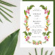 Lindo convite de casamento tropical pintado à mão com aquarela, emoldurado por um delicado arranjo de folhagens tropicais exuberantes e coloridas, flores e beija-flor, dando-lhe uma aparência única e personalizada. Perfeito para qualquer casamento tropical, de verão, de jardim ou de destino