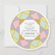 Abstrato geométrico de joia de diamante circular em convite de casamento. Mostra blocos coloridos em rosa, verde-menta, amarelo-claro, mauve e ouro com contorno de brilho dourado que forma uma borda redonda.