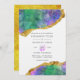 Cartão de convite de casamento com joias roxas e de agata verde com acentos de folha de ouro.