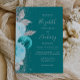 O canto esquerdo deste elegante convite para casamento moderno apresenta um buquê floral em tons de turquesa e azul claro, aparado com folha de falso prateado e folhagem falsa e aspergido com brilho de prata. O texto personalizável combina o script de escrita manual de cinzas de prata pálida, fontes copperplate e itálico em um fundo de turquesa. O verso apresenta uma turquesa e um design floral prateado.