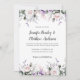 Delicar flores púrpura e cor-de-água cor-de-rosa com folhas verdes escuras e roxas e caules convites para casamento de cima e de baixo. A parte traseira do cartão é rosa pálido. Os modelos de texto são fáceis de personalizar usando texto de caligrafia de ornamentado e uma fonte moderna. Se você quiser esta design em outro produto, ou precisar de ajuda de alguma forma, por favor, entre em contato comigo através da minha loja.