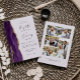 A borda esquerda deste elegante convite de casamento moderno apresenta uma cor d'água roxa, borda agitada, aparada com falso brilho dourado. O texto personalizável combina a escrita manual de cinzas de carvão, as fontes em copperplate e itálico em um fundo de lavanda. Substitua facilmente as cinco imagens de exemplo no verso por suas fotos e adicione um texto breve com informações adicionais (como o URL do seu site).