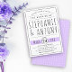 Este convite para o casamento de na moda combina a tipografia moderna, negra e branca, com um pop de púrpura lavanda. O convite mostra seu texto personalizado em uma fonte preta elegante contra um fundo branco limpo, enquanto a data do seu dia especial se destaca em uma faixa de lavanda vibrante. No verso, um padrão delicioso de cruzes brancas em um pano de fundo da lavanda adiciona um toque de charme e singularidade ao design geral.