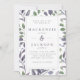 Um convite de casamento moderno e elegante, que inclui uma aquarela, deixa um padrão de fundo em azul e verde em cinza, sobre fundo branco, para um toque de leite, sobreposto com uma estrutura de retângulo duplo. Os detalhes de casamento estão na fonte azul de carvão azul. O reverso está em azul de cinza sólida. Este design funciona perfeitamente para um casamento no inverno.