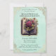 Este convite romântico de casamento apresenta um tema de conto de fadas antigo. Uma imagem de um velho livro de histórias é ilustrada no centro, acentuada com rosas vermelhas. O plano de fundo apresenta um padrão de papel-pergaminho colorido e esfolado. Um quadro dourado do estilo vintage borda o convite. Os nomes do casal são impressos por cima do livro. A localização e os detalhes do casamento de conto de fadas são impressos abaixo em uma letra elegante.