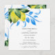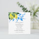 Este elegante convite para o casamento foi feito usando limões de cor d'água originais em tons de amarelo brilhante com folhagem botânica azul e verde. Personalize com seus detalhes personalizados nos campos modelo. Perfeito para casamentos rurais e de destino. Para ver a suíte de casamento moderna correspondente visite www.zazzle.com/dotellabelle Arte e design por Victoria Grigaliunas
