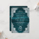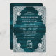 Convite de casamento teal russo com um jarro de mason em um fundo de madeira rústica adorado com um rendas floral branco. Personalize facilmente este convite de casamento teal para complementar seu país rústico, ou festa de casamento de celeiro.