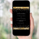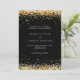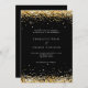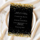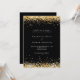 Um convite de casamento moderno. Fundo preto decorado com brilhos dourados falsos. Personalize e adicione seus nomes e detalhes do casamento. Letras brancas coloridas.