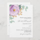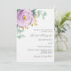 Um fundo branco. Decorados com flores violetas, roxas, flores rosas e folhas verdes de eucalipto de cor aquosa, galhos, verde e borras de ouro falsas. Personalize e adicione seus nomes e detalhes. Voltar: adicione o URL do seu site de casamento ao código QR para obter detalhes e/ou RSVP.