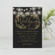 Um convite de casamento preto e dourado com luzes bonito de cordas e uma delicada garland floral rústica desenhada à mão de folhagem botânica com tipografia de na moda. Personalize com sua informação especial do dia do casamento. Projetado por Thisnotme©