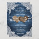 Estes românticos convites para casamentos azuis e rústicos, com corações de burlap, sobre um fundo de madeira adornado com rendas florais brancas e luzes de cordas são perfeitos para convidar seus hóspedes para seu empoeirado país rústico azul, quintal ou festa de casamento de celeiro.