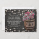 Convites de casamento de um país na moda com um pano de fundo preto rústico, luzes cintilantes de cordas, rosas rosa e flores ciganas, um barril de madeira de adega com as suas iniciais e um pedaço de corda com nós.
