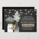 MASON JAR STRING LUZ CONVITES DE CASAMENTO | Fundo preto-branco-rústico, luzes cintilantes de cordas, frasco de pedras e garrafa com etiqueta de presente à sua volta, com iniciais de casais, flores brancas, madeira de campo e belas palavras de casamento. Encontre outros convites para casamento em http://www.zazzle.com/special_stationery*