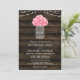 Convite para casamento no campo com um jarro de mason com buquê de hydrangea cor-de-rosa, pendurado de luzes de cordas em um fundo de madeira de celeiro escuro.