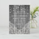 Um convite de casamento preto e branco rústico simples com luzes de corda e renda sobre um fundo de madeira. Mensagem para mim se precisar de ajuda ou tiver alguma solicitação especial.