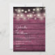 Um convite de casamento na moda rustic com luzes bonito de cordas acima dos nomes de casais felizes, colocado em um roteiro elegante acima dos detalhes especiais de casamento em um fundo de madeira vermelha rusticada. O reverso apresenta um fundo de madeira rústica correspondente. Projetado por Thisnotme©