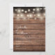 Um convite de casamento na moda rustic com luzes de cordas bonito acima dos nomes de casais felizes, colocado em um roteiro elegante acima dos detalhes especiais de casamento em um fundo de madeira rústica. O reverso apresenta um fundo de madeira rústica correspondente. Projetado por Thisnotme©