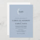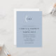Este convite moderno de casamento oferece um design mínimo de sotaque com um gráfico de coroa e monograma em um belo fundo azul empoeirado. A coroa é mostrada em branco, embora possa ser alterada para qualquer outra cor.