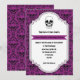 Este convite para o casamento de Halloween, cor damasco e faixa de crânios roxos e pretos, mostra a sua redação e uma faixa numa moldura feita de padrão floral e crânio úmido.