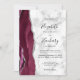 A borda esquerda deste elegante convite de casamento moderno apresenta uma cor d'água borrifada com borda cortada com cintilação falsa de prata. O texto personalizável combina manuscritos, copperplate e fontes itálicas em preto em uma cinza e fundo de mármore branco. O lado inverso apresenta um design de burgundy e agate prateado.