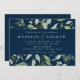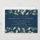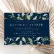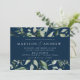 Convites de casamento botânico elegantes, com cor d'água luxuosa, junto aos seus detalhes de casamento, com um fundo azul marinho. Os convites de casamento verdes modernos invertem para mostrar um fundo de marinho sólido. Projetado para coordenar com nossa coleção de casamento Abundant Greenery.