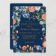 Uma ilustração aquosa de um buquê de pénia brilhante em azul marinho e laranja. O buquê consiste de peônias com flores grandes e redondas e folhas verdes profundas. O fundo é marinho azul. Convites e material de casamento correspondentes estão disponíveis neste conjunto de coleções