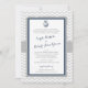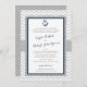 Design do estilo zigzag da cinza náutica em cinza e azul marinho. Anchor design com corda e o olhar de uma colmeia de cinza neste único convite para casamento na praia.