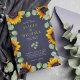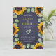 Um convite de casamento ao estilo rústico elegante com uma cor d'água, folhas de folhagem de eucalipto verde e um quadro de girassol de ouro amarelo e uma tipografia de tendência quic sobre um fundo azul escuro de meia-noite de marinho. ++++++++++ Adequado para primavera, verão e outono casamentos de jardins de campo, quintal ou cerimônias de casamento de fazendas, festas de casal ou aniversários.