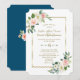 Design romântico e elegante com flores cor-de-rosa, pinceladas, creme-d-água, quadro de ouro único, divisor floral; no buquê floral traseiro sobre fundo azul-oceano. Use a ferramenta Personalizar para adicionar suas informações e fazer alterações. Itens correspondentes podem ser encontrados na minha Coleção de Flores de Blush de Primavera.