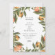 Rústico pomar de laranja, convite para casamento. O cartão apresenta belas frutas pintadas de citrinos de laranja, folhagem de folha verde e soalhos florais brancos. Estilo simples de design de tipografia clássica, e coordenação de sombra de cor verde de caçador escuro.