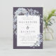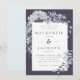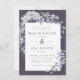 Um convite de casamento impressionante perfeito para o inverno com uma moldura de cor d'água em cascata, hidrangeas azuis poeirentas e folhas sobre um fundo azul escuro. O centro contém um retângulo branco com detalhes de casamento em azul de ardósia e fonte de serifa de carvão. O reverso está em azul sólido/poeirento.